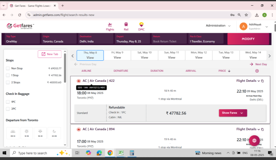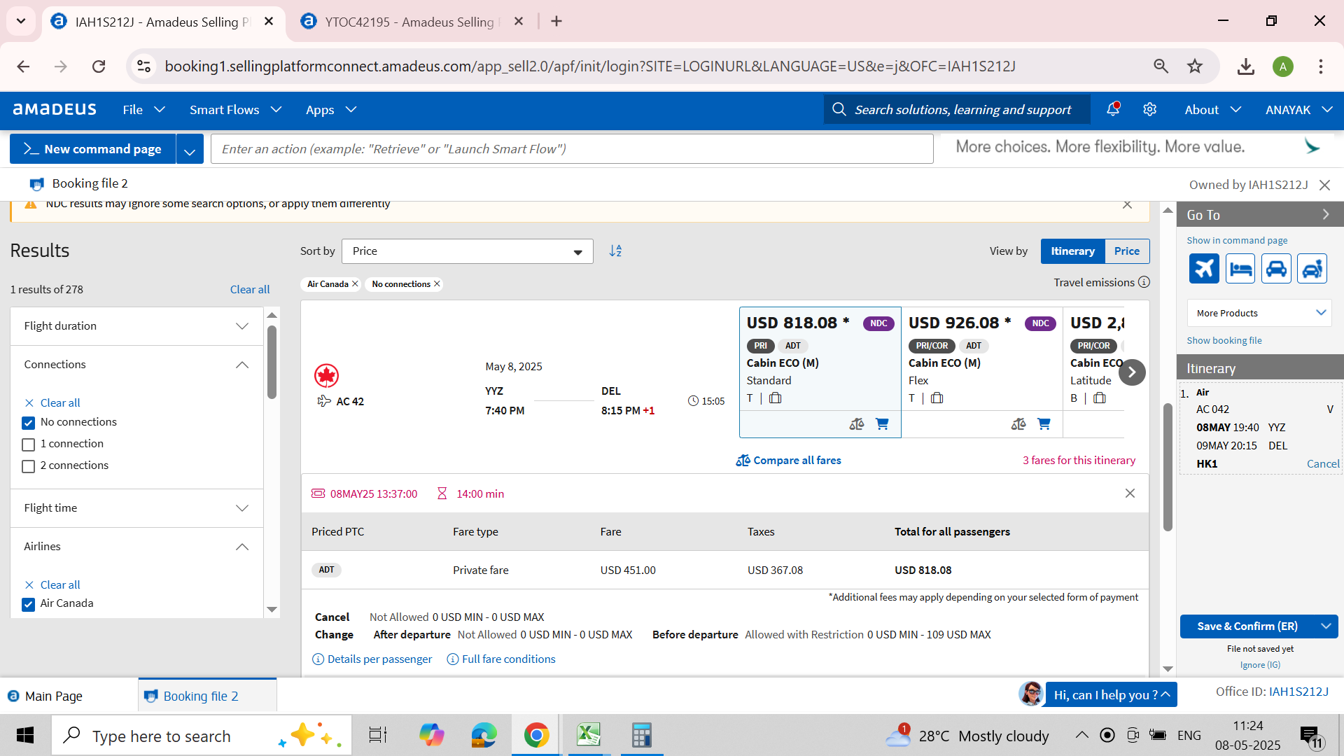 1 AC 042 T 08MAY 4 YYZDEL DK1 740P 815P 09MAY